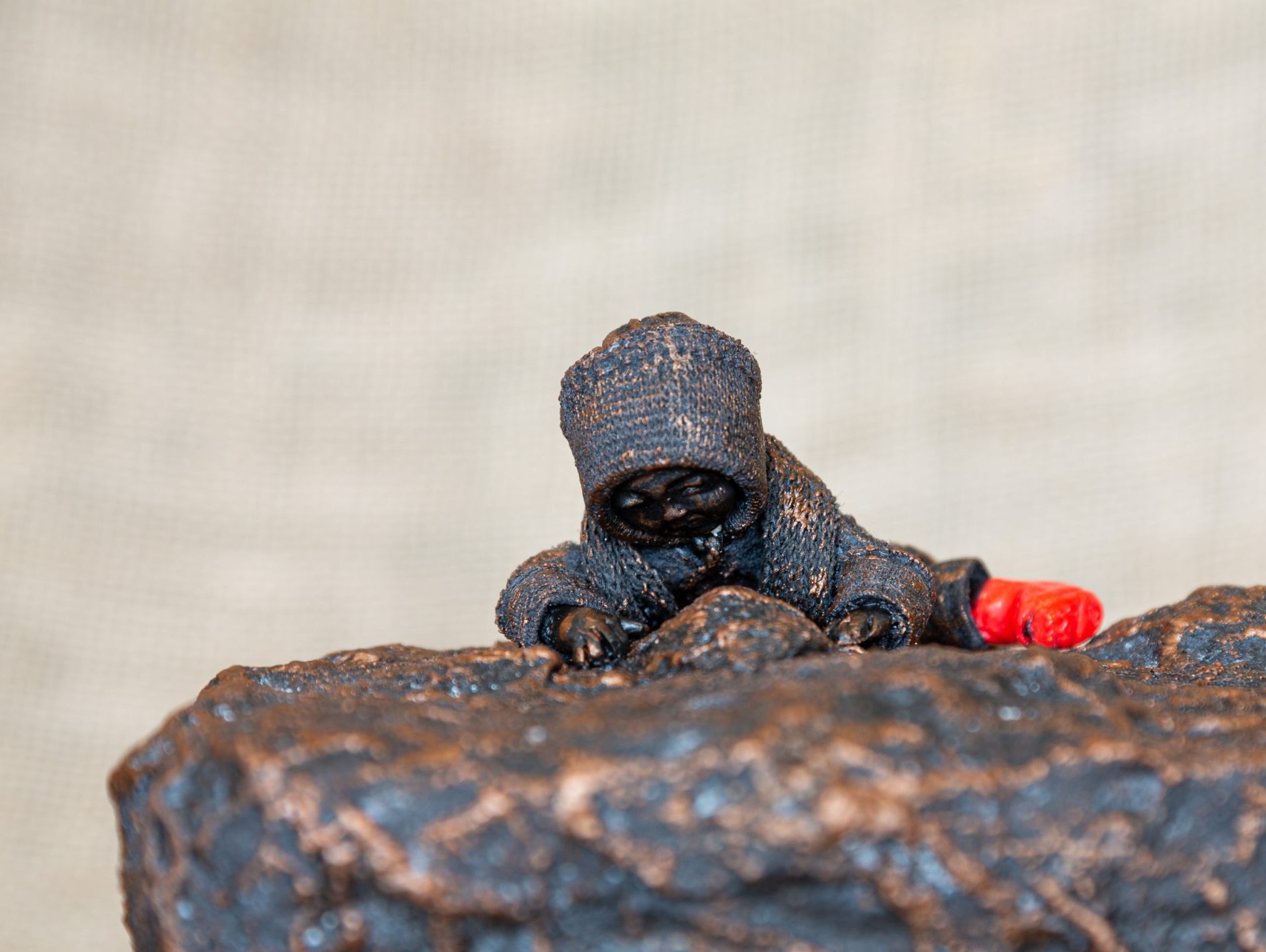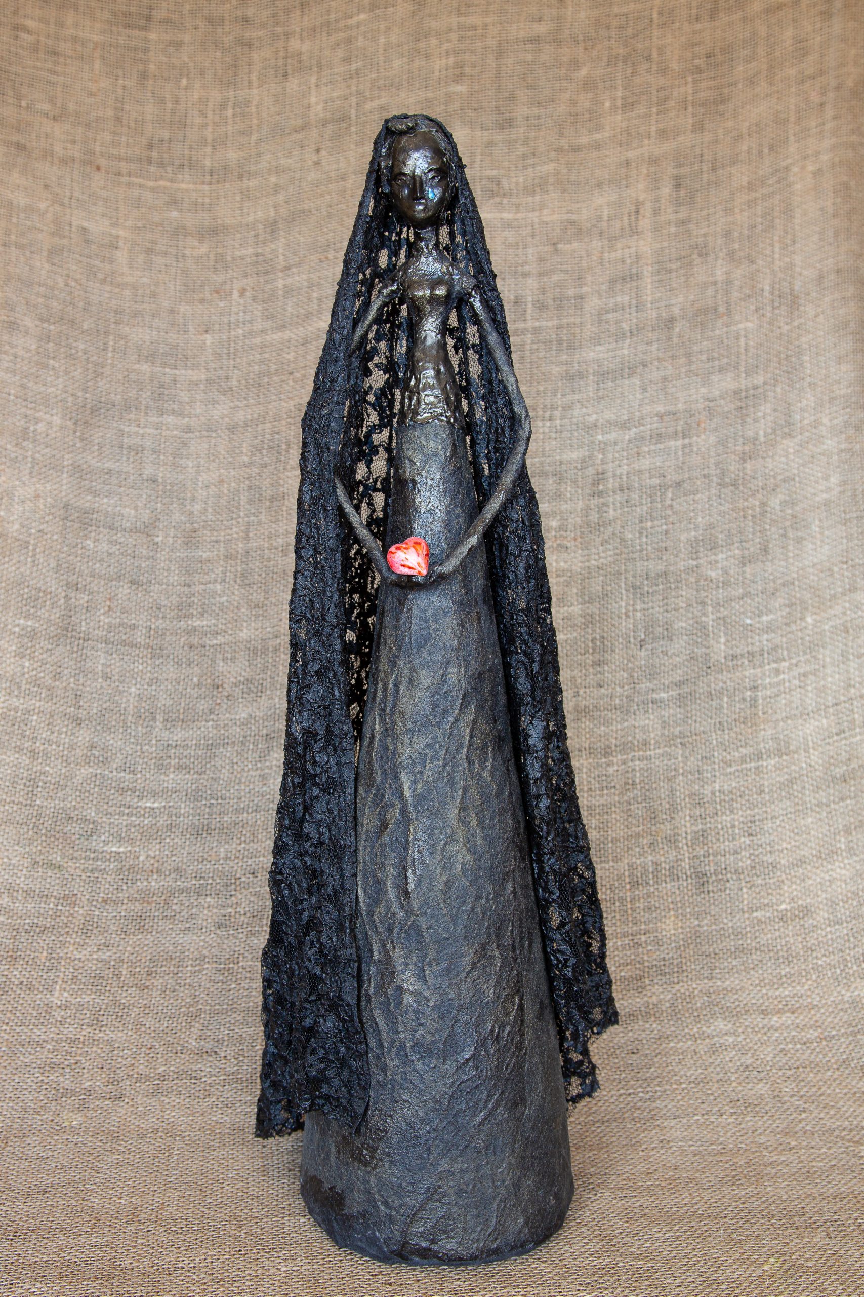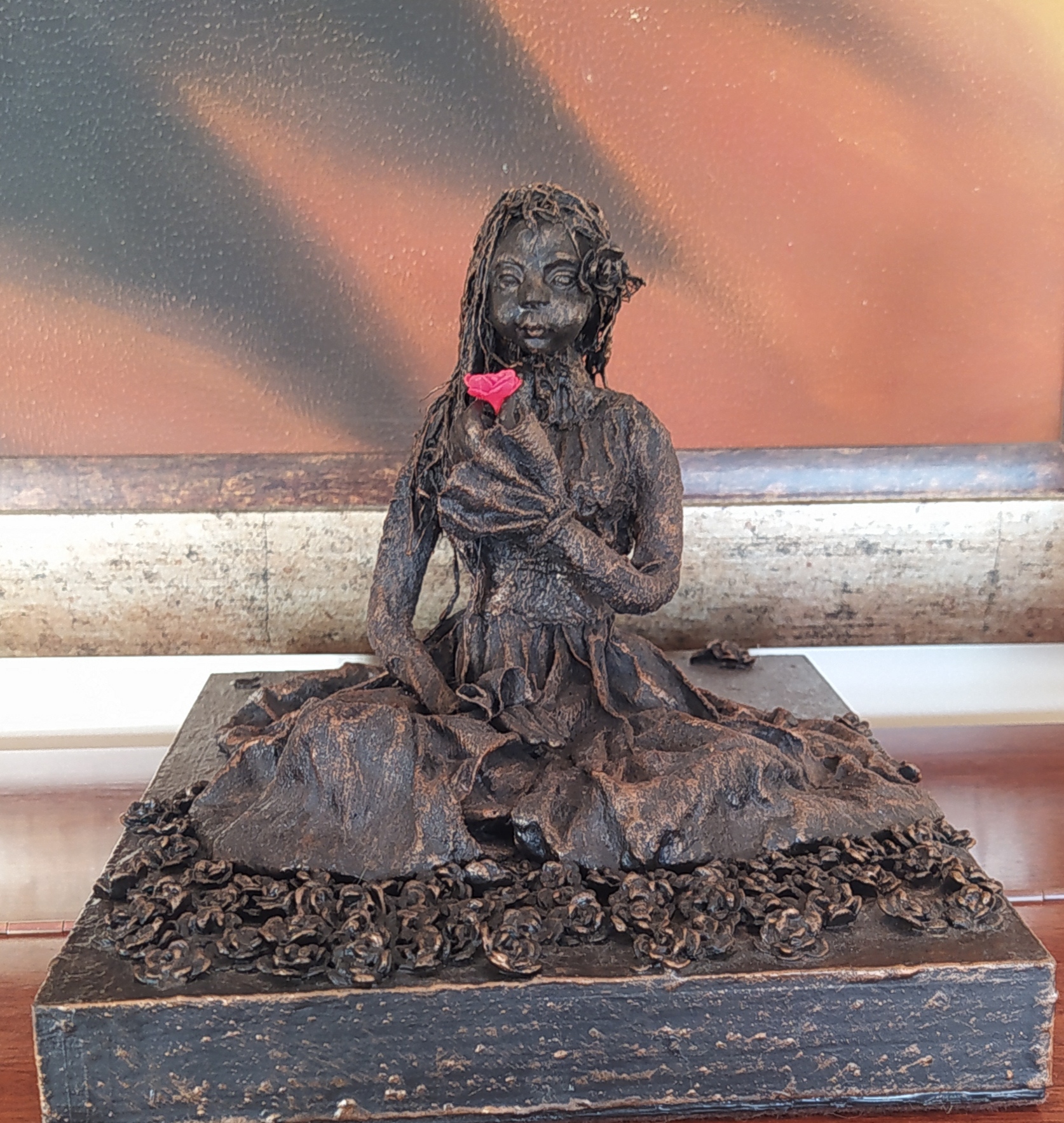 No artwork just happens and it is always a long and beautiful (sometimes difficult) journey. Starting with an idea, that leads to tons of research into the idea, into the elements of the idea, different artists and their interpretation of the idea and absolutely going with Picasso’s saying that ‘good artists copy, great artists steal’ concept. After hours on-line, reading, listening, looking and planning how to get the idea into being it’s time to get down to making the artwork. Combining polymer clay, recyclable materials, aluminum foil and fabric, the sculpture is created. Everything is then covered with black Paverpol before being dry brushed with copper Paverpol, to create the old copper effect. And finally the signature element of a single colour (red boots, a red heart, a golden necklace, blue beads, etc.) is added to complete the work.
